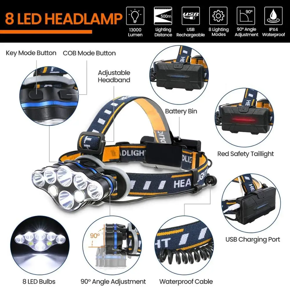 [شحن USB و 8 أوضاع إضاءة] مصباح المصباح الأمامي LED مجهز ببطاريتين قابلتين للفصل. يمكنك استخدام كابل USB المرفق لشحنه لفترة طويلة. يحتوي المصباح الأمامي LED على 8 أوضاع إضاءة ، يمكن أن ينخفض رأس المصباح 90 درجة ، يمكنك ضبط وضع الإضاءة واتجاهها وفقًا لاحتياجاتك ، إنه سهل الاستخدام للغاية.
